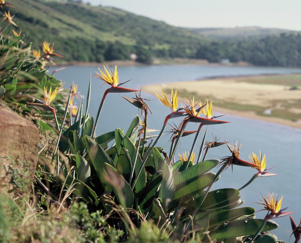 南アフリカ イースト ロンドン近郊 クウェレハ川口の断崖に咲くレギーネの花は、川面の上空に向かって、いま、まさに飛び立とうとしている姿を見せてくれています。こんな躍動的な花が他にあるでしょうか。花、といえば、殆どが丸い形で、円満、そのものを表現しています。それに引き換えストレリチアは、直線に近い形状の鋭い姿で、一つの方向を指し示しています。動きを現しているのです。ストレリチアは他の花のように見る人に安らぎを与えるよりは、激しく、ゆさぶり、刺激しているようにも思えるのです。思えばストレリチアは、私たちに取っては新しく出現してきた花で、まだまだ、未知の分野を多く抱えています。この花の姿が「大きな飛躍」を望んでいるように感じられてなりません。そのエネルギーに私は動かされているのだと信じています。