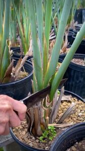 白然の掟から離れたストレリチアは、野放図な生長に走るから、何らかの規制が必要ではないか、というのが前章でした。そこで代わりに取り得る技術の一つが剪定です。ストレリチアには枝がありませんから、整理して切り落とすのは、葉、葉柄しかありません。タダ、心得ておかなければならないのは、余分な生長を押さえるのですから、少々の無理は仕方ないことです。