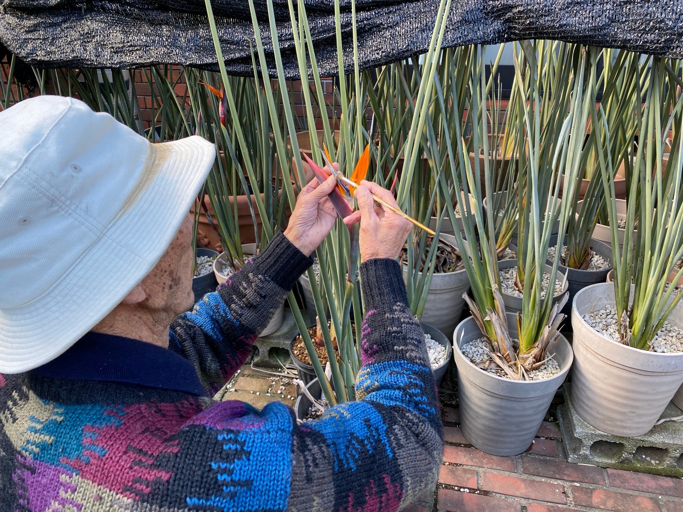 鳥ではメジロが来ることもありますが、蜜の吸い方を知らず、また知ったところで嘴の構造が違いますから無理です。ストレリチアの花はサンバードと共同で進化したもので、他の鳥や虫が来ることは想定していません。お陰で我が国では、ストレリチアの花は長く咲いていられます。種子を採るために花粉を付ければ話は別です。ストレリチアは花を咲かせるだけでも養分の消耗が激しいですから、種子を生産させたら、疲れ果てます。必要も無いのに種子はつけないことです。
