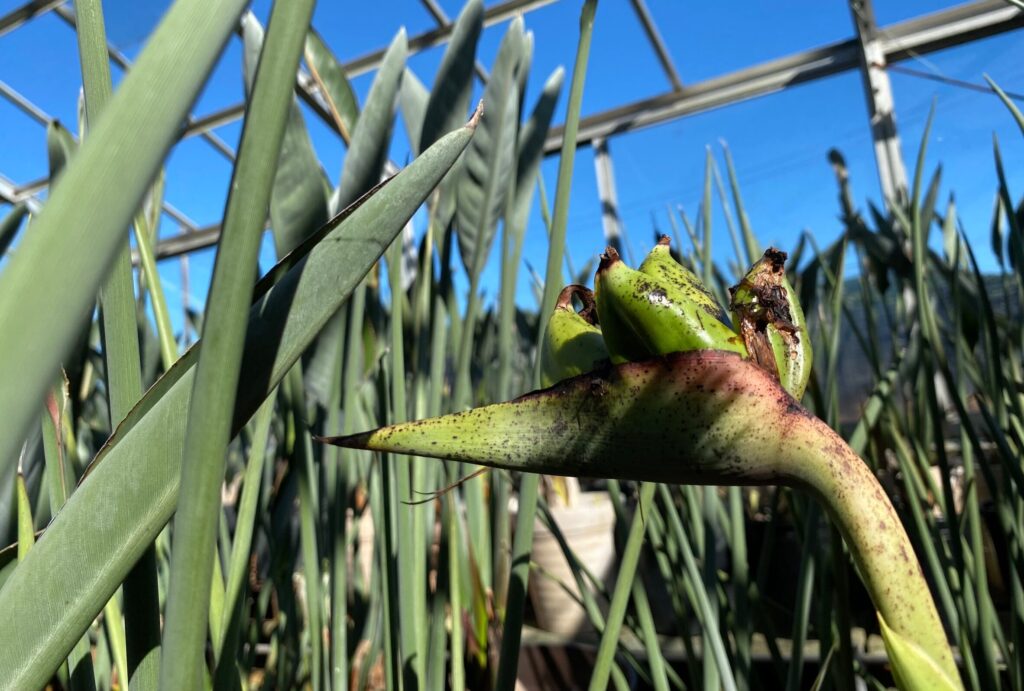 ストレリチアの種子は小豆粒ぐらいの大きさで頭に帽子のようなオレンジ色の毛のような房がついていて「仮種皮」と植物学上では呼ばれています。初めの頃は、この房は発芽に関係すると思われていましたが、ファン ダ フェンター博士の研究で、発芽には何の関わりもないことが分かり、播く時には取去ってしまうことを勧められたので、以後、ずうっと、そうしてきてはいますが、では、いったい、これは何のだめにあるのか、いまだに分かっていません。